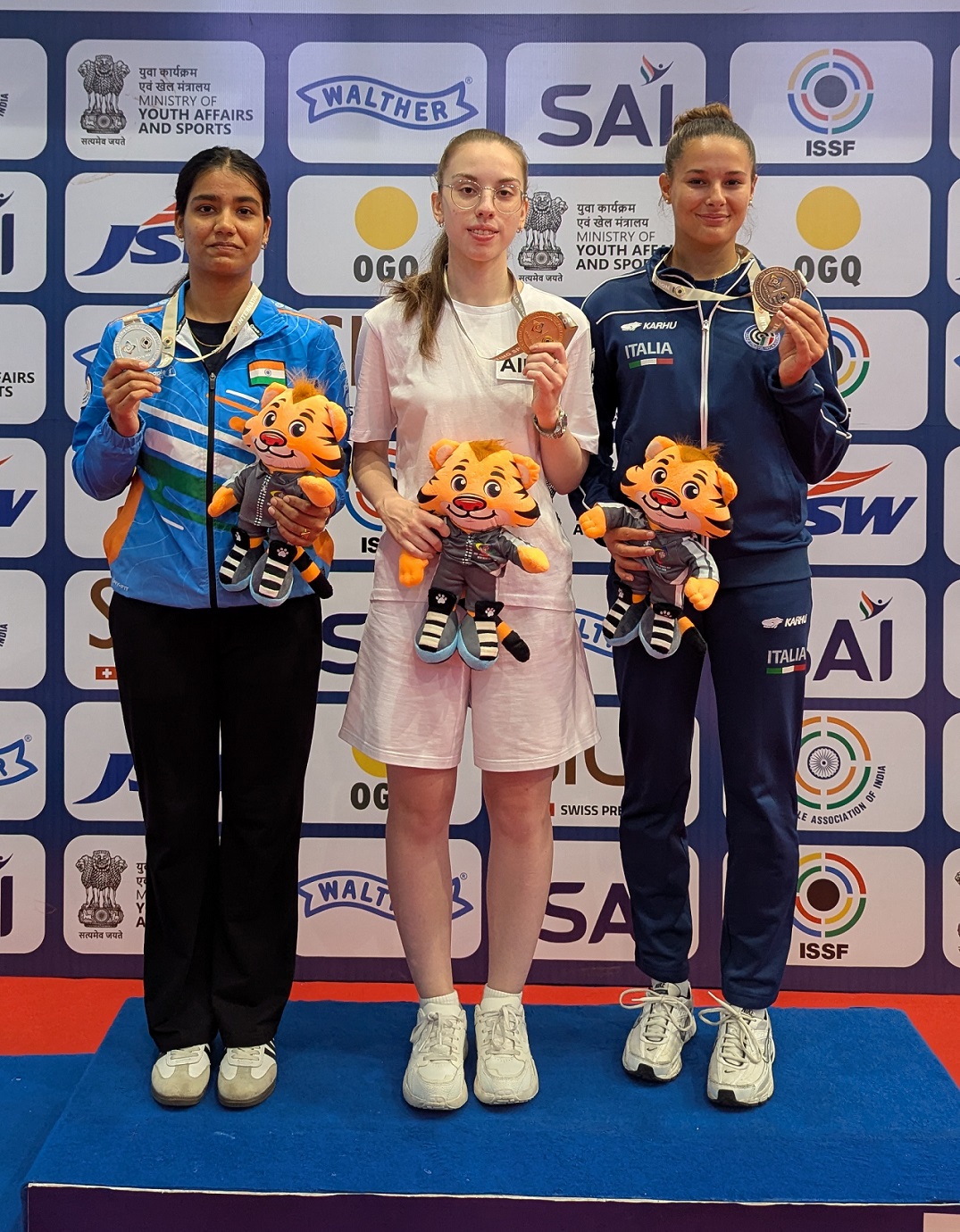 25 मीटर पिस्टल महिला जूनियर फ़ाइनल में तिखोनोवा शुरू से ही लय में रहीं और 33 हिट्स के साथ स्वर्ण पर कब्ज़ा किया। जर्मनी के सुहल में जूनियर वर्ल्ड कप की स्वर्ण विजेता रहीं तेजस्वनी ने 30 अंकों के साथ रजत अपने नाम किया। उन्होंने क्वालिफिकेशन में 580-17x के साथ दबदबा बनाया था। वहीं, इटली की एलेस्सांद्रा फ़ैत ने 28 हिट्स के साथ कांस्य पदक हासिल किया।