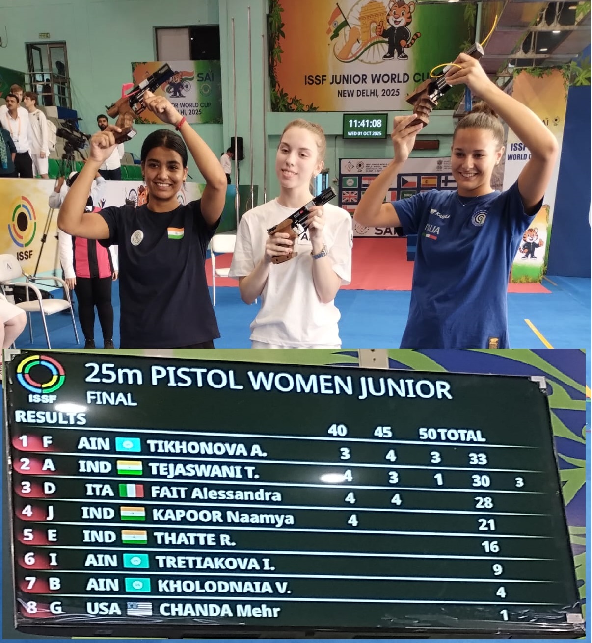 नई दिल्ली, 1 अक्टूबर 2025: भारत के लिए आईएसएसएफ जूनियर वर्ल्ड कप राइफल/पिस्टल/शॉटगन नई दिल्ली 2025 ऐतिहासिक रहा, जिसमें बतौर मेजबान उसने अंतिम दिन तक पदक तालिका में शीर्ष पर रहते हुए अपना दबदबा कायम किया। राजधानी दिल्ली स्थित डॉ. कर्णी सिंह शूटिंग रेंज में आयोजित बुधवार को अंतिम दिन जूनियर महिला 25 मीटर पिस्टल स्पर्धा में तेजस्वनी ने रजत पदक जीतकर भारत की झोली में एक और पदक जोड़ा। इस स्पर्धा का स्वर्ण इंडिविजुअल न्यूट्रल एथलीट (आईएनए) अलेक्ज़ेंड्रा तिखोनोवा ने जीता, जबकि चेकिया की टेरेज़ा ज़ाविस्कोवा और टोमस नैंटल की जोड़ी ने हमवतन लिया कूचेरेवा और कामिल बेदनार को हराकर ट्रैप मिक्स्ड टीम जूनियर स्वर्ण अपने नाम किया।
