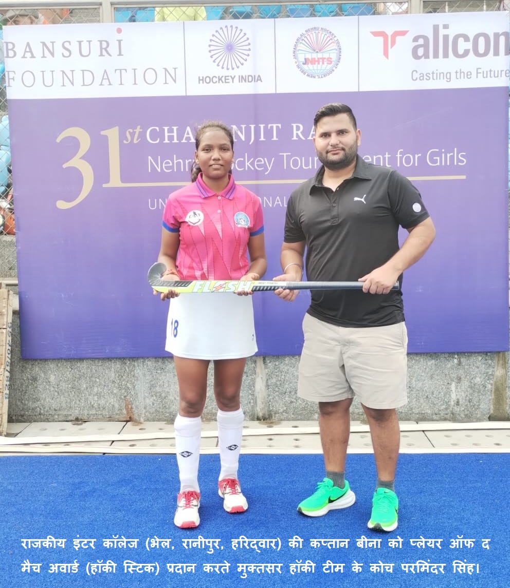 नई दिल्ली, 25 अक्टूबर, 2025: राजकीय इंटर कॉलेज (भेल, रानीपुर, हरिद्वार) ने लगातार तीसरी जीत हासिल करके 31वें नेहरू गर्ल्स हॉकी टूर्नामेंट 2025 में अपना अभियान आगे बढ़ाते हुए तीसरे चरण में प्रवेश कर लिया है। उत्तराखंड की अंडर-17 बालिका टीम ने शनिवार को असम की स्कूल टीम को 5-1 से धो डाला। हरिद्वार की जीत का आकर्षण फॉरवर्ड करीना की हैट्रिक और मुक्ता के दो गोल रहे। लेकिन दोनों के गोल में अहम योगदान देने के लिए कप्तान बीना को प्लेयर ऑफ द मैच घोषित किया गया। सेंटर हाफ की पोजिशन पर खेलने वाली कप्तान बीना को प्लेयर ऑफ द मैच अवार्ड (हॉकी स्टिक) मुक्तसर हॉकी टीम के कोच परमिंदर सिंह ने प्रदान किया।