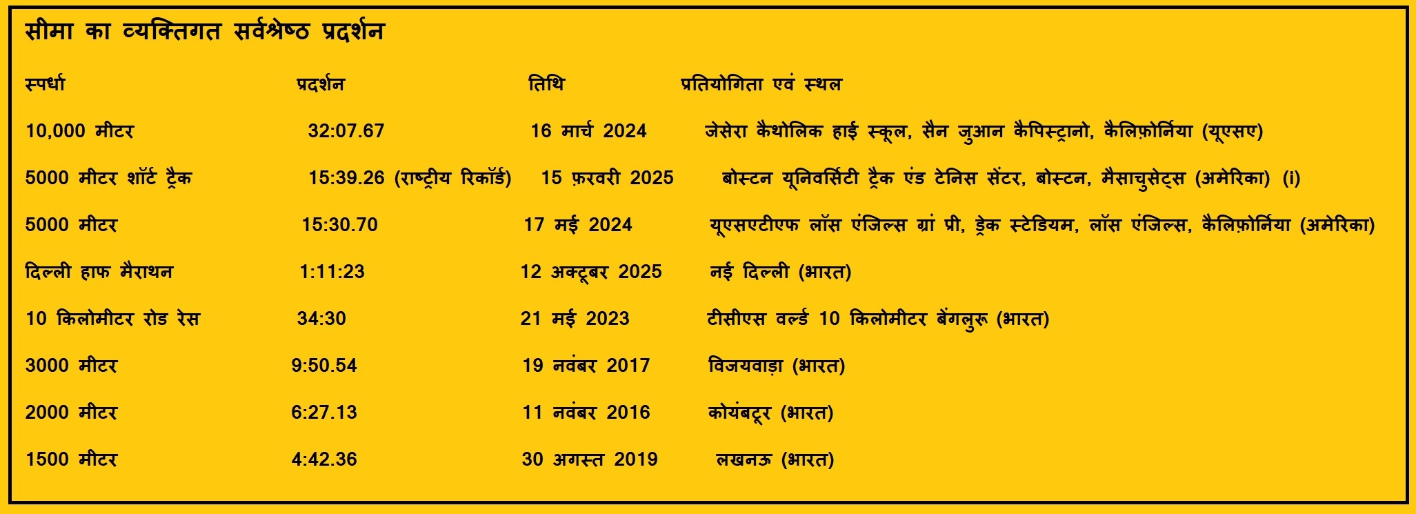 सीमा ने अपनी पहली दिल्ली हाफ मैराथन में एक घंटा 11 मिनट 23 सेकेंड का व्यक्तिगत सर्वश्रेष्ठ समय भारतीय एलीट महिला वर्ग का जीता। इस जीत के बावजूद सीमा के मन में कसक साफ नजर आई। उनका कहना था, “मैं यहां पहली बार दौड़ी हूं और अपने पहले ही प्रयास में अपना पर्सनल बेस्ट टाइम निकालने में सफल हुई। लेकिन मुझे इस बात की कसक है कि मैं वेदांता दिल्ली हाफ मैराथन में कोर्स रिकॉर्ड को बेहद नजदीकी अंतर से नहीं तोड़ा पाई।”