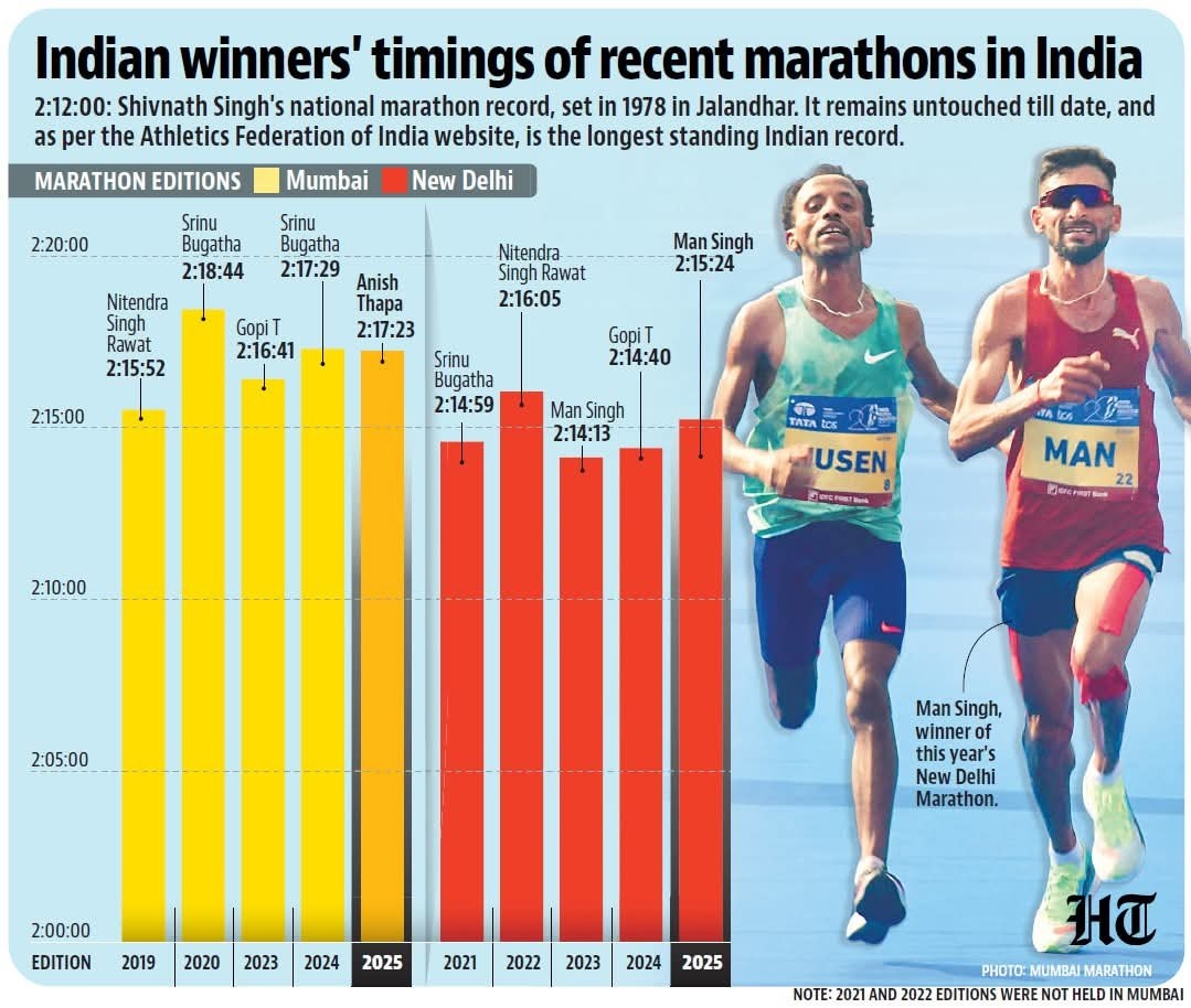 बेशक, इन सवालों के जवाब आयोजकों, औद्योगिक घरानों, बड़ी कंपनियों और पेशेवर लोगों के पास नहीं है। शायद उन्हें यह भी याद दिलाने की जरूरत नहीं है कि देश के अब तक के श्रेष्ठ मैराथन धावक शिवनाथ सिंह का 48 साल पुराना राष्ट्रीय रिकॉर्ड उन्हें मुंह चिढ़ा रहा है। 1978 में शिवनाथ ने जालंधर में 2 घंटे 12 मिनट (02:12:00) में मैराथन दौड़ पूरी कर जो करिश्मा किया था उसे आज तक कोई भी भारतीय तोड़ नहीं पाया है। जहां तक महिलाओं की बात है तो 2015 में बीजिंग में हुई वर्ल्ड चैंपियनशिप के दौरान ओपी जैशा ने 2 घंटे 34 मिनट 43 सेकेंड (02:34:43) का समय निकालकर राष्ट्रीय रिकॉर्ड बनाया था। शिवनाथ का प्रदर्शन लंबे समय तक चलने वाला भारतीय रिकॉर्ड है।