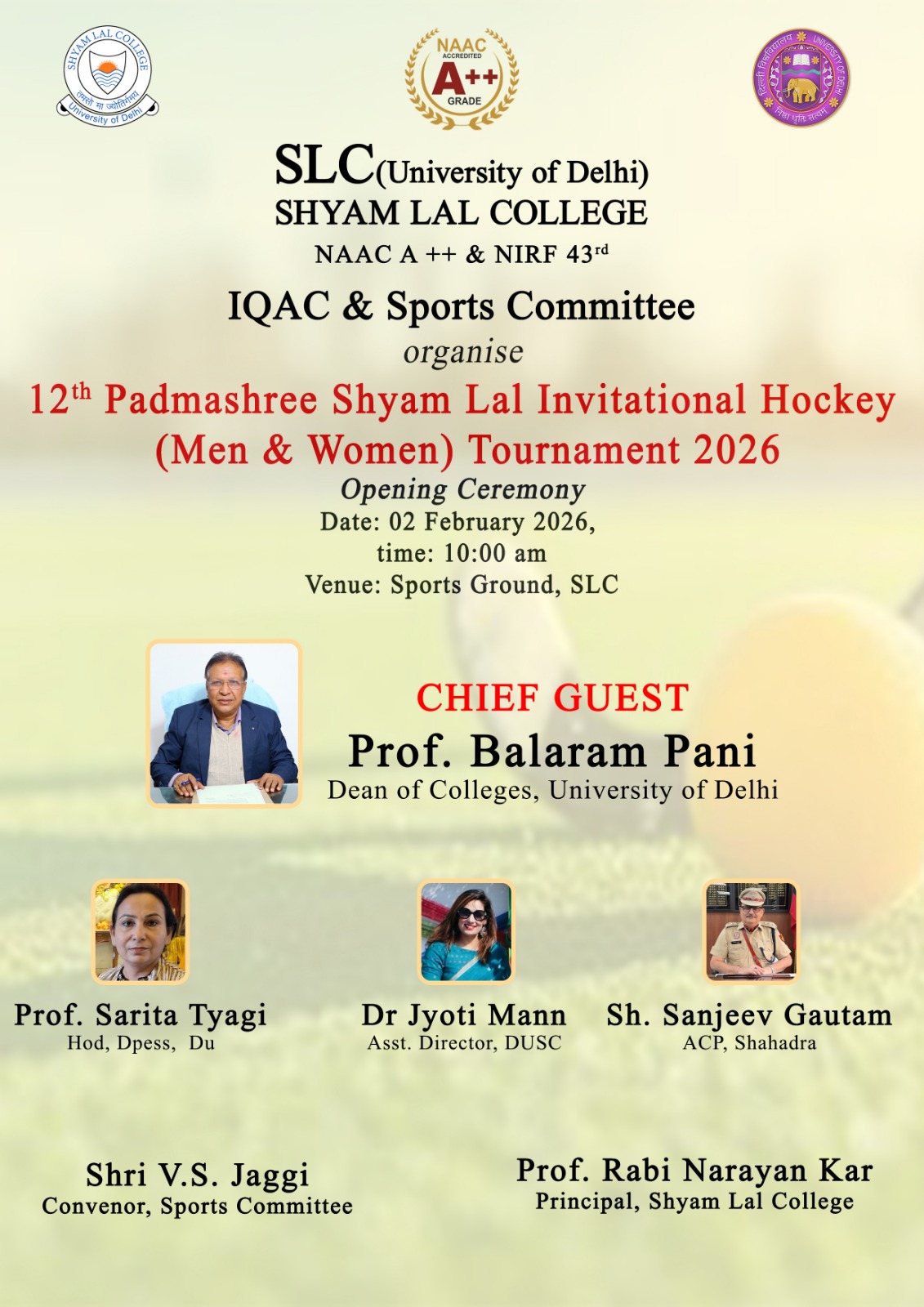 नई दिल्ली:12वें पद्मश्री श्याम लाल मेमोरियल आमंत्रण हॉकी टूर्नामेंट का आयोजन 2 से 9 फरवरी, 2026 तक किया जाएगा। इसमें दिल्ली यूनिवर्सिटी के टॉप कॉलेजों की पुरुष व महिला टीमें शिरकत करेंगी। मेजबान श्याम लाल कॉलेज के प्रधानाचार्य प्रोफेसर रबि नारायण कर के अनुसार, दिल्ली यूनिवर्सिटी के डीन ऑफ कॉलेजेस प्रोफेसर बालाराम पाणि मुख्य अतिथि होंगे और टूर्नामेंट का उद्घाटन सोमवार को सुबह 10.30 बजे, श्याम लाल कॉलेज, शाहदरा के मैदान पर करेंगे। इस अवसर पर डीपीईएसएस (डीयू) की एचओडी प्रो. सरिता त्यागी, डीयूएससी की असिस्टेंट डारेक्टर डॉ. ज्योति मान, एसीपी (दिल्ली पुलिस) संजीव गौतम सम्मानित अतिथि के रूप में मौजूद रहेंगे।